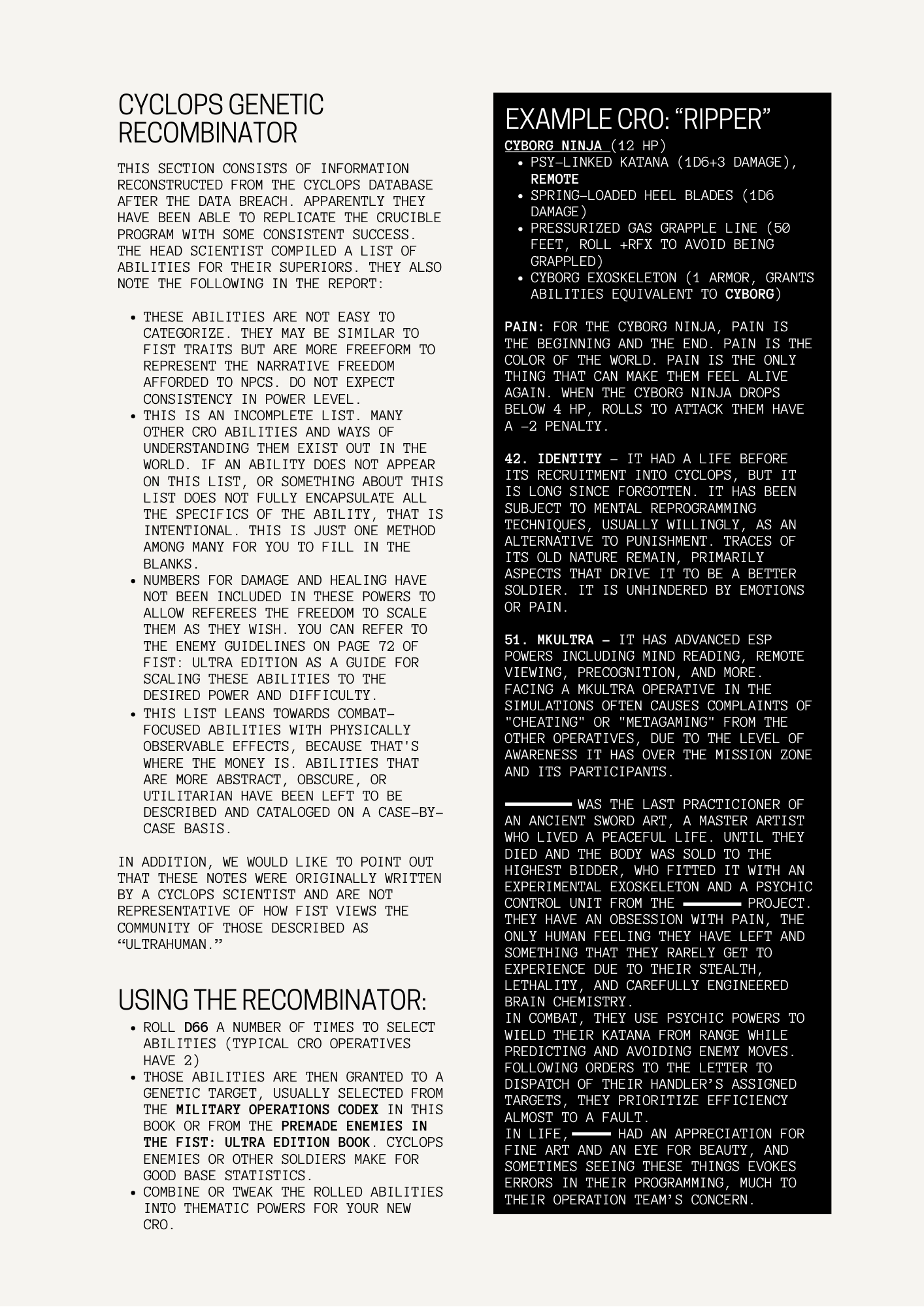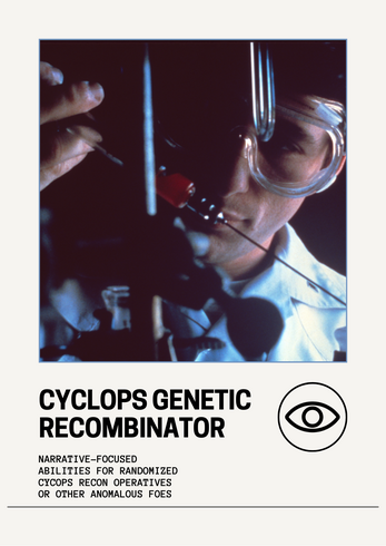- CYCLOPS GENETIC RECOMBINATOR - A table of 36 narrative abilities similar to Traits for rolling up random Cyclops Recon Operatives or other ultrahumans. (also check out BIRDS OF PREY: A CRO generator table for FIST by BIRDS OF PREY for more ways to flesh out your CRO teams!